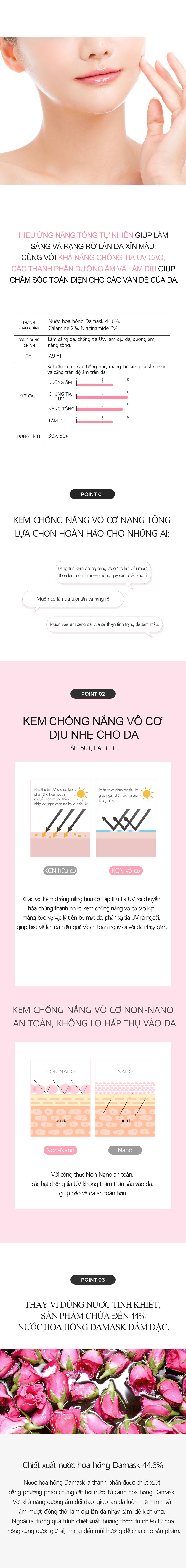 Kem chống nắng vô cơ chứa 44% nước hoa hồng Damask giúp chống nắng, kiềm dầu và nâng tông tự nhiên.