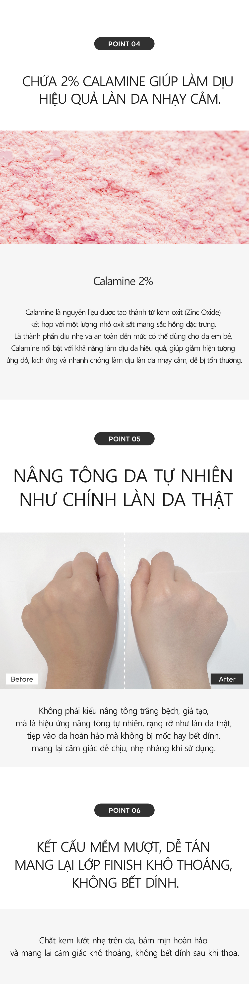 Sản phẩm có kết cấu dạng kem ẩm mịn, có khả năng bám dính tốt và cho một lớp “finish” hoàn hảo đồng thời chứa nhiều thành phần có tác dụng cấp ẩm và làm dịu, chăm sóc hiệu quả các vấn đề phức tạp của da.