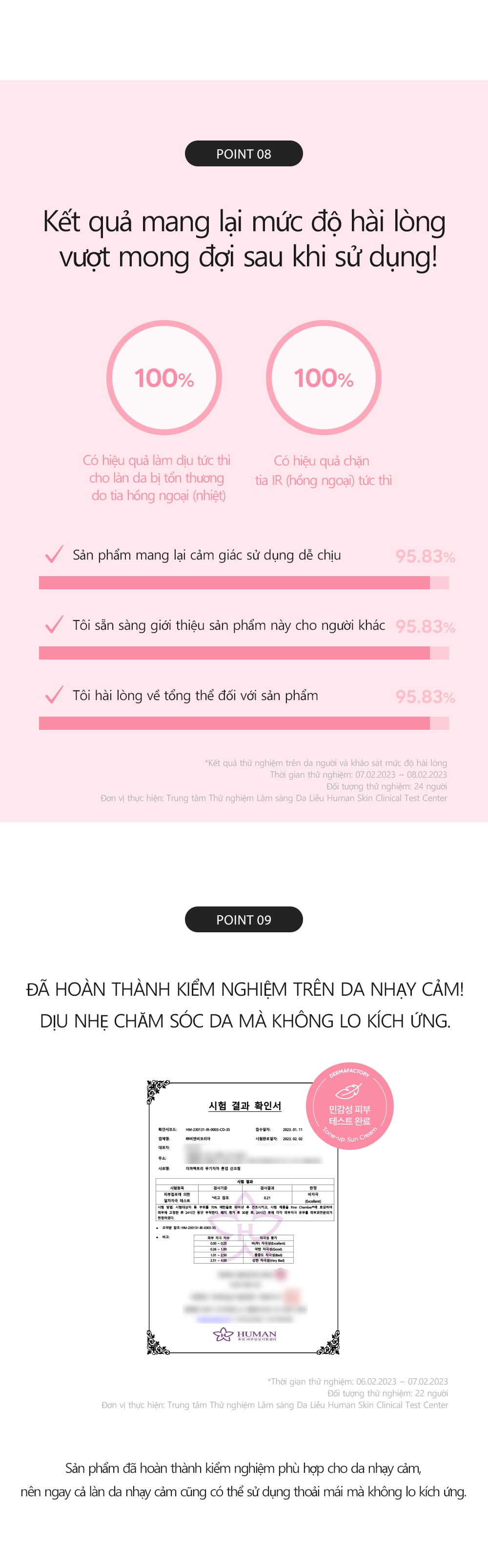 - Hiệu quả chính: Chống tia cực tím, làm dịu da, dưỡng ẩm, nâng tông