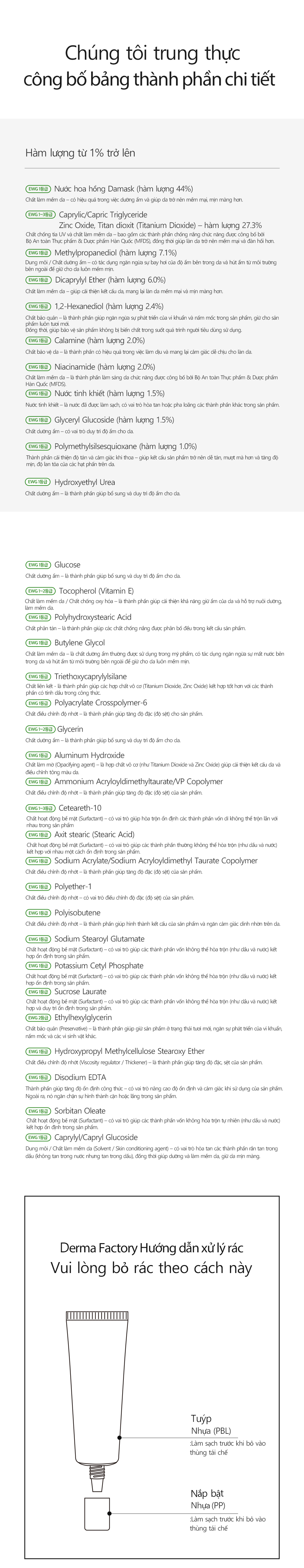 - Thành phần chính: Nước hoa hồng Damask 44%, Niacinamide 2%, Calamine 2%, thành phần chống nắng